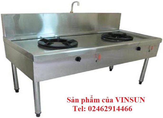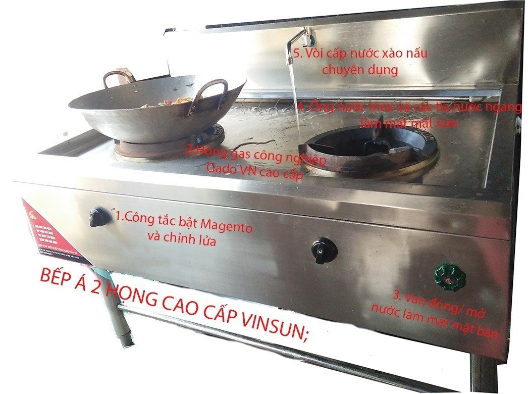 Bếp á công nghiệp 2 họng 1 vòi nước Vinsun hay bếp á nhà hàng 2 họng. Bếp do Công ty Ứng dụng công nghệ Việt Nam trực tiếp sản xuất và phân phối. Bếp dùng họng gas Gado Việt Nam cao cấp đánh lửa Magento siêu bền, ống gang dẫn gas 2 vòng lửa nên món ăn được chín đều mà tiết kiệm gas. Đặc biệt, bếp được trang bị hệ thống nước làm mát mặt bàn và Vòi cấp nước xào nấu chuyên dụng. Tất cả tạo lên sản phẩm bền đẹp, dùng tiện lợi, an tòa. Chính vì vậy sản phẩm được các Bệnh viện, trường mầm non, khách sạn và cửa hàng trong trên 63 tỉnh thành tin dùng.
