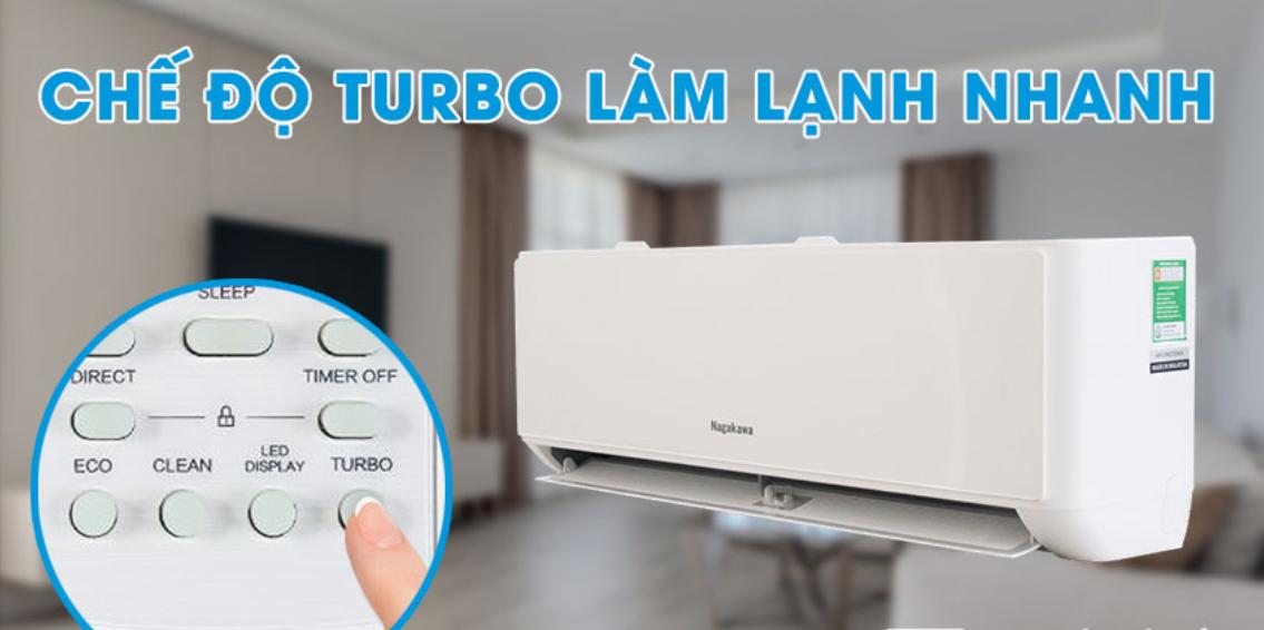 Khi chế độ làm lạnh nhanh Turbo được kích hoạt trên remote, điều hòa Nagakawa 9000bttu NS-C09R2T30 sẽ hoạt động ở mức công suất cao nhất để làm lạnh và thổi luồng khí mạnh mẽ hơn giúp không gian được làm mát trong thời gian ngắn.