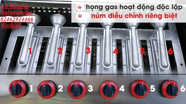 Lò nướng Salamander 6 Họng GAS VINSUN có 6 Họng gas độc lập, có núm điều chỉnh riêng. Khi nướng ít thì chỉ cần mở họng gas chỗ chứa thực phẩm cần nướng. Những họng gas khác có thể tắt bớt để tiết kiệm nhiên liệu.