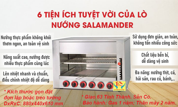 Lò nướng thực phẩm tiện lợi cho các bếp ăn:Lò nướng Salamander 6 Họng GAS VINSUN với 6 Họng gas, nướng thực phẩm năng suất cao, tiết kiệm nhiên liệu. Sử dụng van gas gia đình nên rất tiện lợi so với loại van gas công nghiệp.